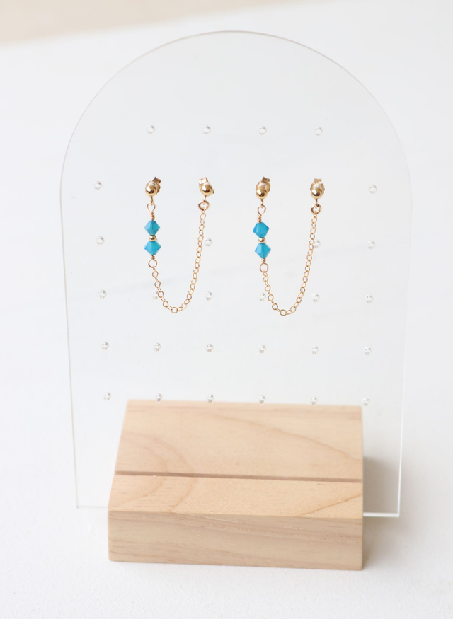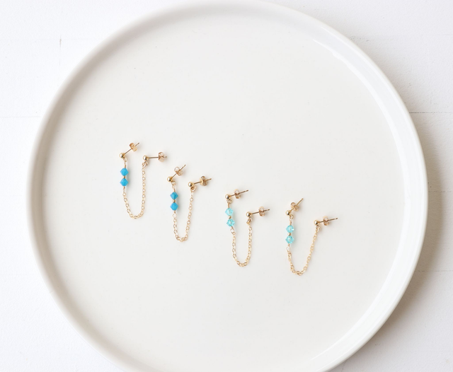 Boucles d'oreilles 2 clous chaîne pendante en Or Laminé (Gold Filled) 14K, Perles en Cristal